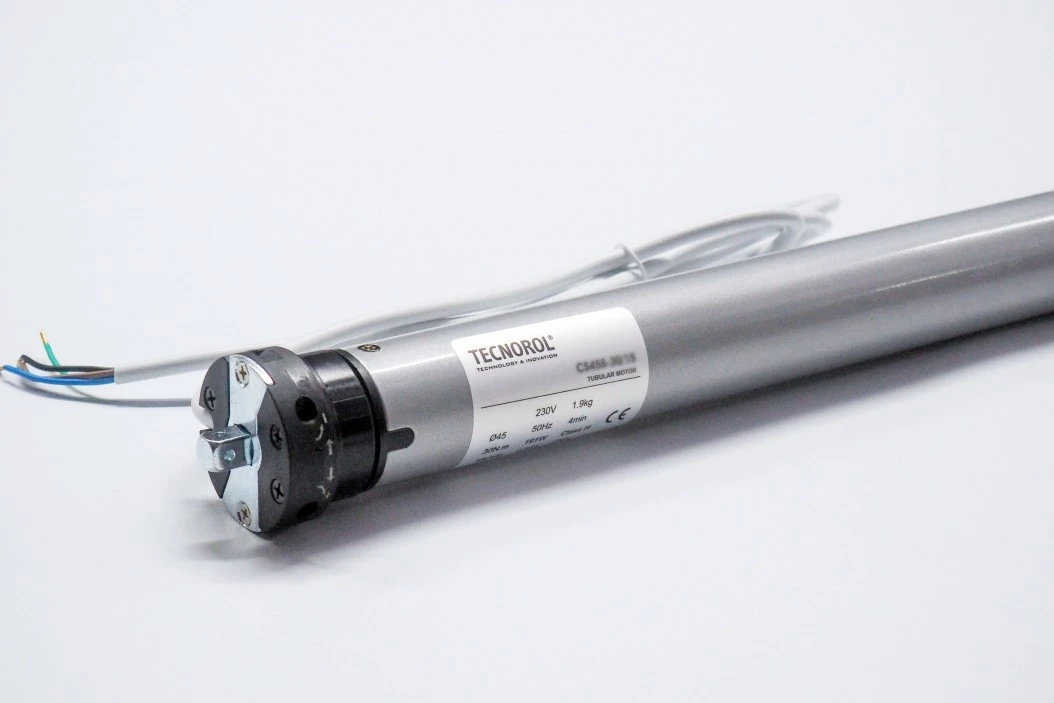 Motor Tubular com 45mm de diâmetro e 49cm de comprimento.