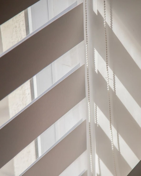 Estore de rolo noite e dia, horizontalmente listado, com uma faixa transparente e outra opaca, a correrem uma sobre a outra, para permitir uma dualidade de funções, conforme a necessidade.